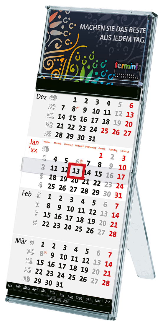 Bei unserem terminic Tischständer Quadro aus stabilem Polycarbonat mit 4-Monatsübersicht ist Ihre Werbung wie unter Glas geschützt und entspricht so auch am letzten Tag des Jahres immer noch „glanzvoll" dem Niveau Ihres Hauses. Profitieren Sie außerdem von der Möglichkeit, das Kalenderteil (Kompaktplaner) des Tischständers Quadro jedes Jahr einfach und preisgünstig nachzurüsten – das entlastet Ihr Werbebudget in den Folgejahren. Kein Wunder also, dass dieser kompakte Tischkalender für Büro und Alltag zu den beliebtesten Kalendermodellen aus unserem Haus zählt. Insbesondere in Kombination mit einem terminic Wandkalender mit Mehrmonatsansicht erhalten Sie die doppelte Durchschlagskraft für Ihre Werbebotschaft und bleiben garantiert im Gedächtnis Ihrer Zielgruppe, 365 Tage im Jahr!